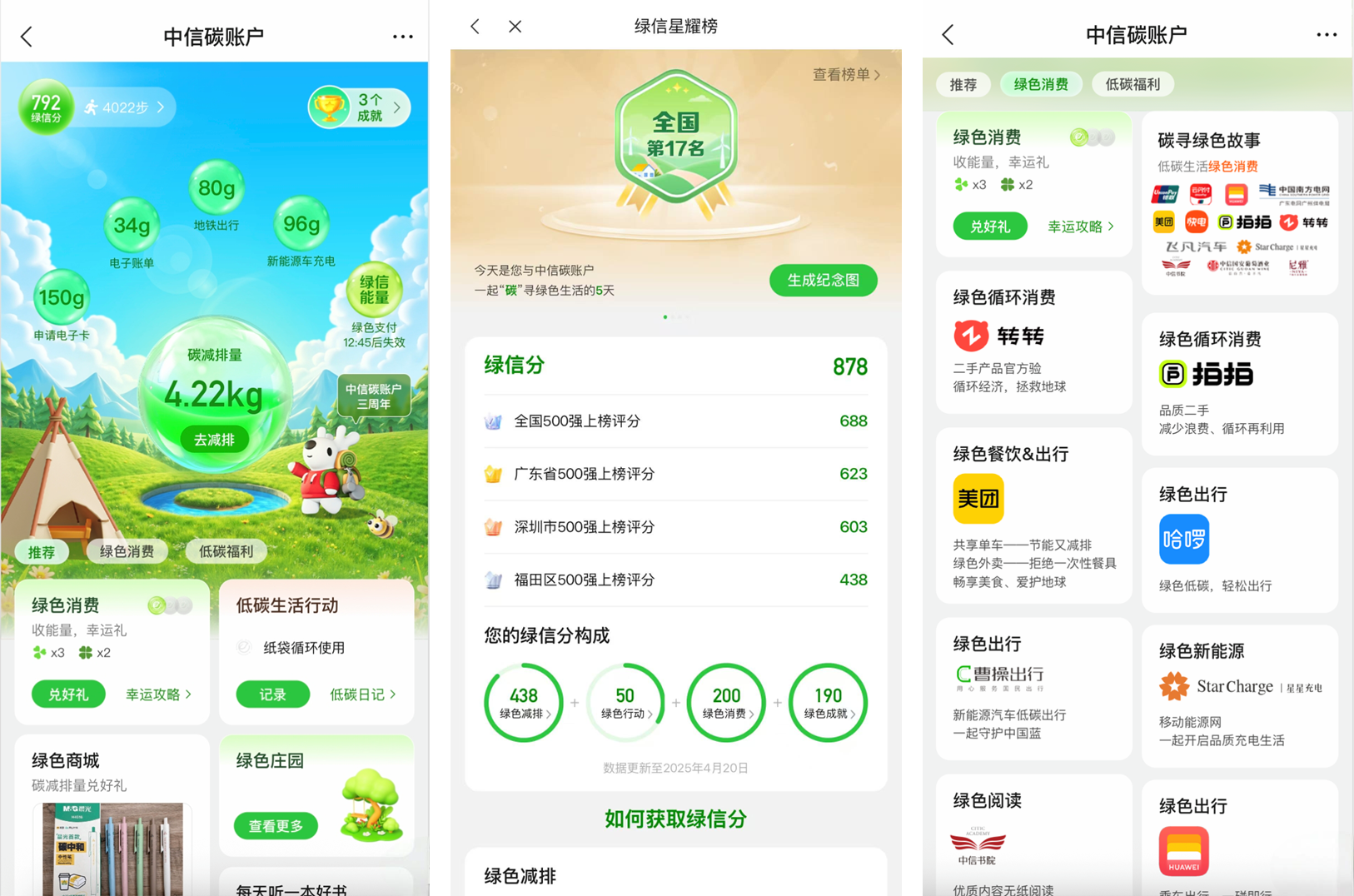 “中信碳賬戶”正式上線3周年以來,持續(xù)升級功能體驗,增強用戶激勵,提升用戶參與綠色生活的獲得感,近期上線全新“綠信分”體系,從四大維度綜合記錄用戶綠色生活足跡,通過區(qū)域環(huán)保榜單給予用戶綠色榮譽激勵,為綠色生活增添成就感。