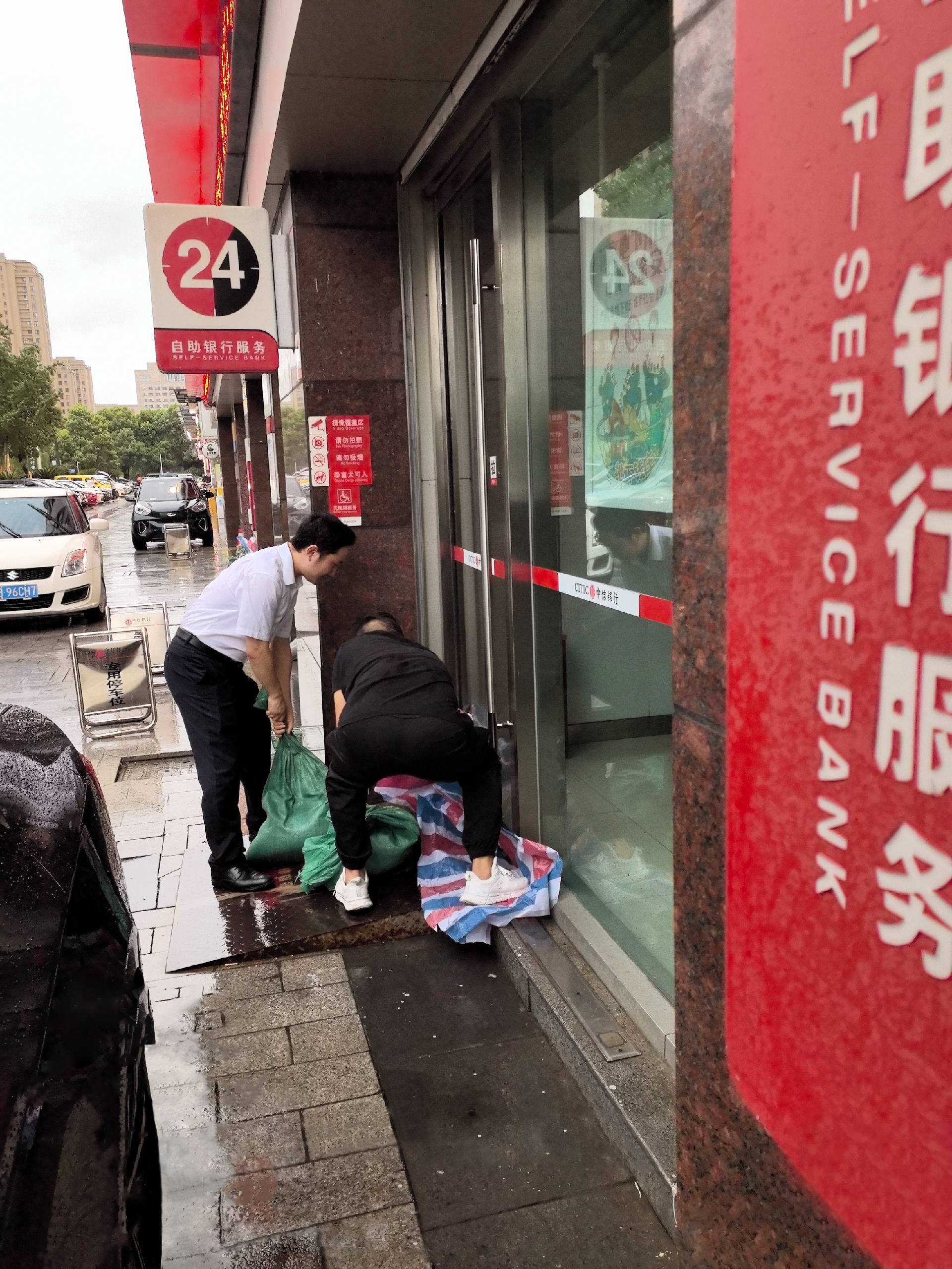 2025年7月29日,中信銀行寧波分行象山支行員工在營業(yè)網(wǎng)點(diǎn)外蓋擋風(fēng)布、壓防洪沙袋,提前做好防汛應(yīng)急工作。