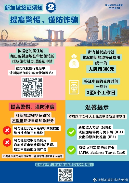 這一期,我們帶您了解辦理新加坡簽證的費(fèi)用及簽證申請(qǐng)的受理時(shí)間。不要讓不法之徒有機(jī)可乘,盜取您的錢財(cái)或個(gè)人信息!欲知更多詳情,請(qǐng)瀏覽新加坡移民與關(guān)卡局網(wǎng)站:https://www.ica.gov.sg/